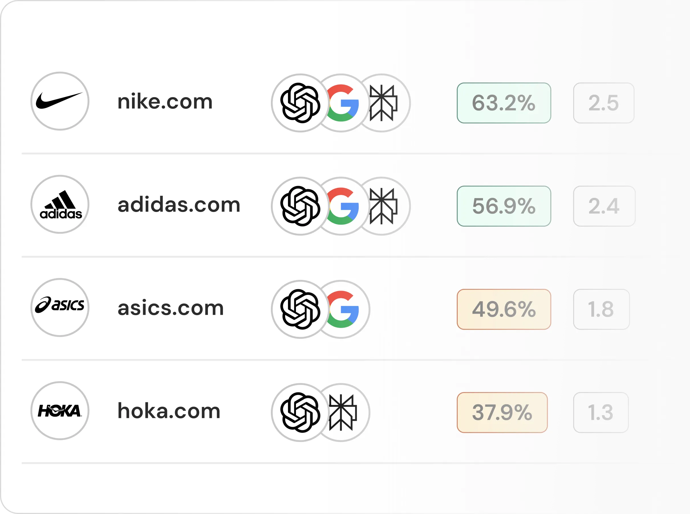 Track your brand across ChatGPT, Perplexity, Gemini, and more. See which products get recommended, which get excluded, and who’s beating you — by surface, by product, every day.