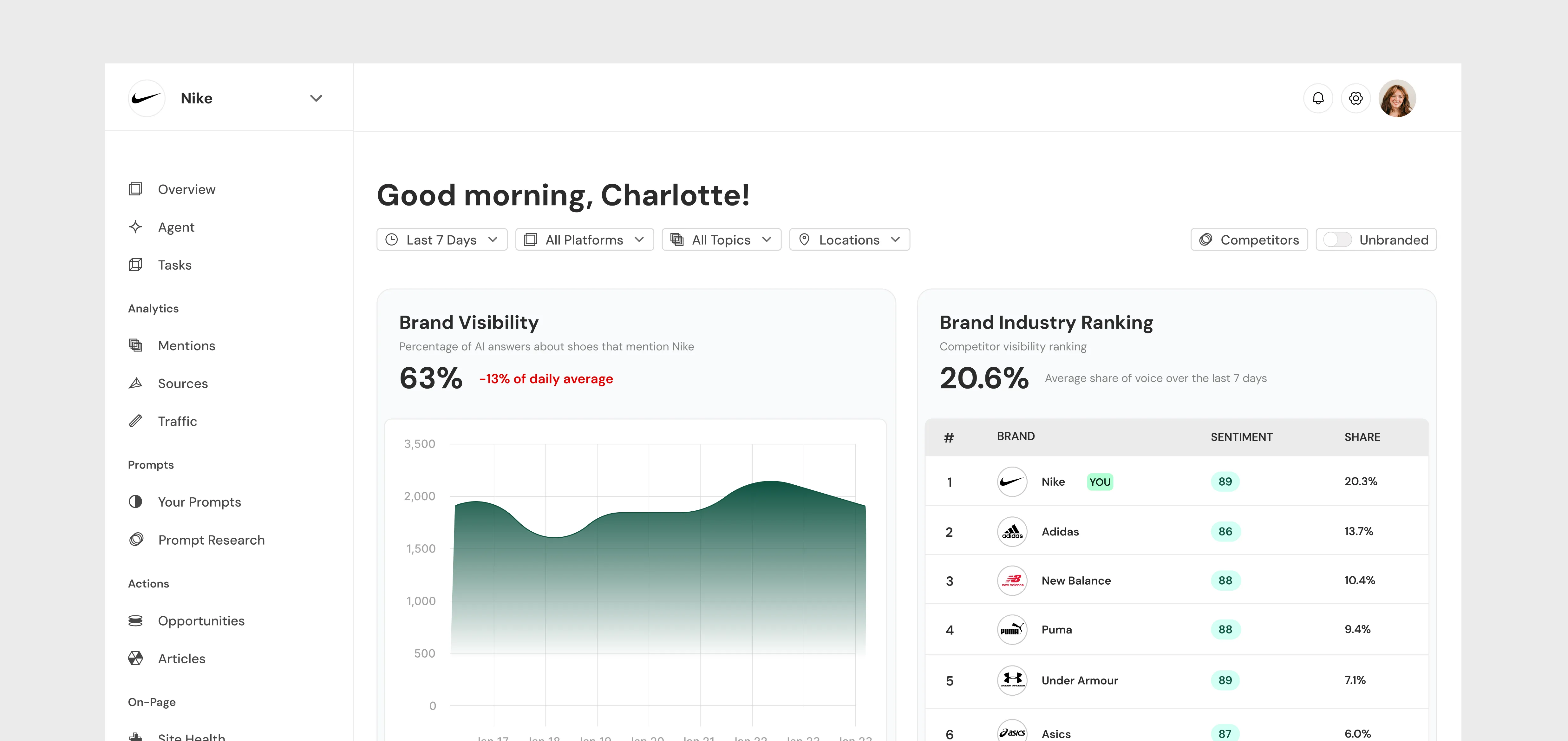 Not a chatbot. A command center. Ask it to run an audit, fix a category, or analyze a competitor. It knows your brand — and it executes.